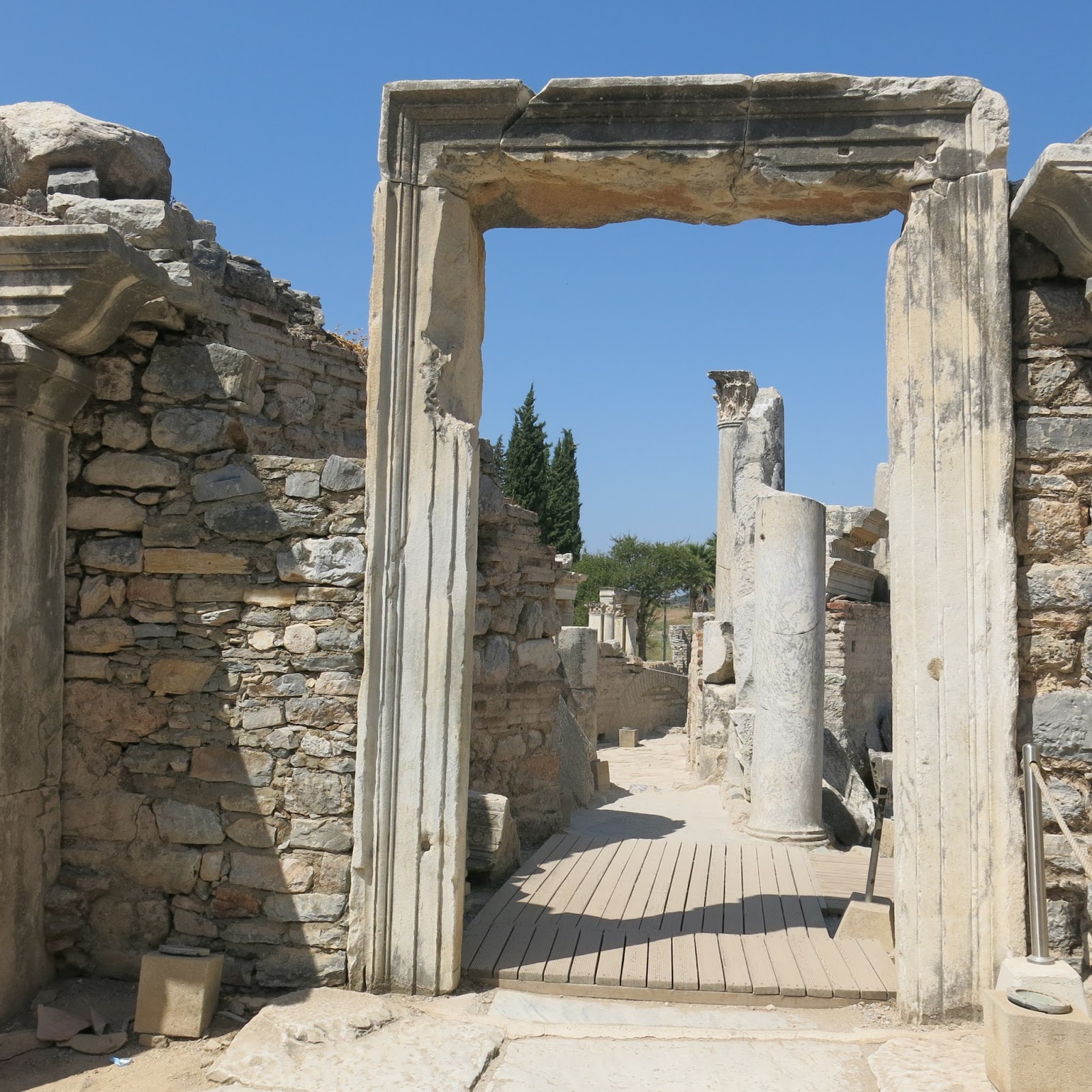 | Celsuksen kirjaston julkisivu, joka rakennettiin 1970-luvulla uudelleen alkuperäisistä rakennuskivistään |